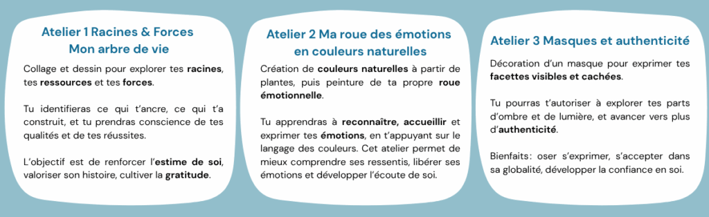 Ce module d’ateliers propose un véritable voyage intérieur, guidé par la créativité et la bienveillance. Aucun prérequis nécessaire.